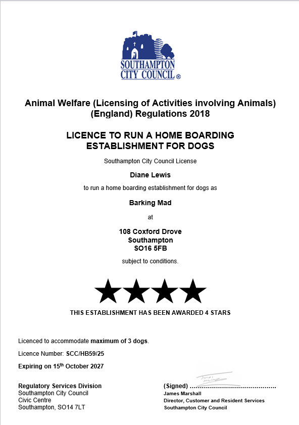 023 8212 3563 diane.lewis@barkingmad.uk.comAt Barking Mad Southampton, we understand that your dog is more than just a pet — they’re a beloved member of the family. That’s why we offer bespoke, one-to-one home dog boarding that’s tailored to your dog’s needs and personality. Whether you’re going away for a weekend or planning a longer break, we ensure your dog receives the same love, care, and attention they’d get at home — with none of the stress of kennels.